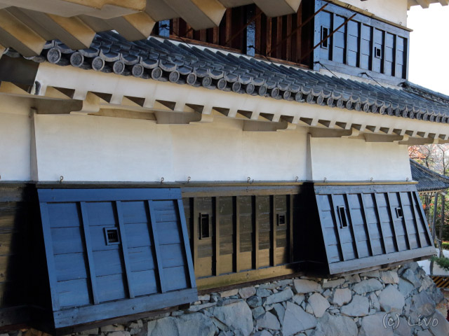 - Tsukimi-yagura: Hold néző szárny, melyet Naomasa Matsudaira (Tokugawa Ieyasu unokája) építettet 1636-ban. Úgy tartják ebből a helységből háromszor látszik a Hold. Egyszer az égen, másodszor a víz felszínén, harmadszor a sake-s pohárban.